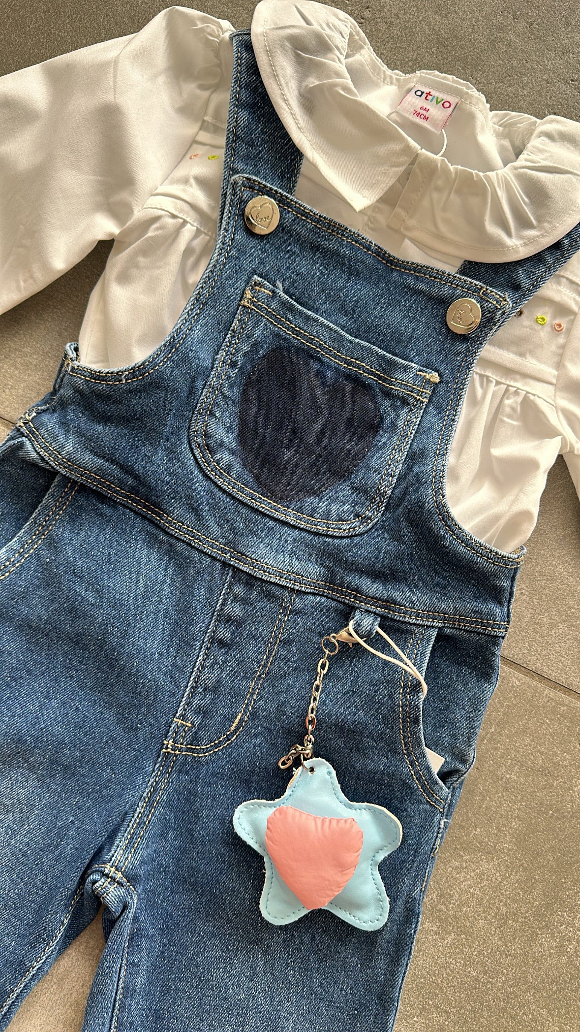 salopette con ciondoli, camicia a parte